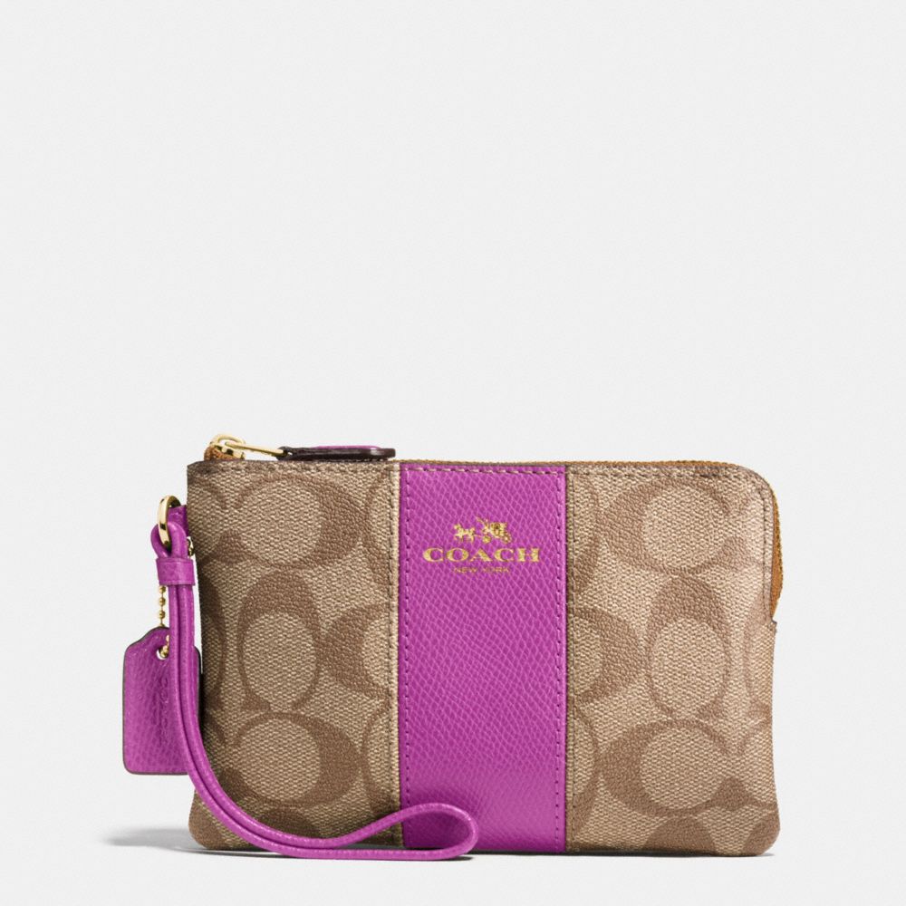 1. COACH f58035 - CORNER ZIP WRISTLET IN SIGNATURE COATED CANVAS WITH LEATHER STRIPE - IMITATION GOLD/KHAKI/HYACINTH