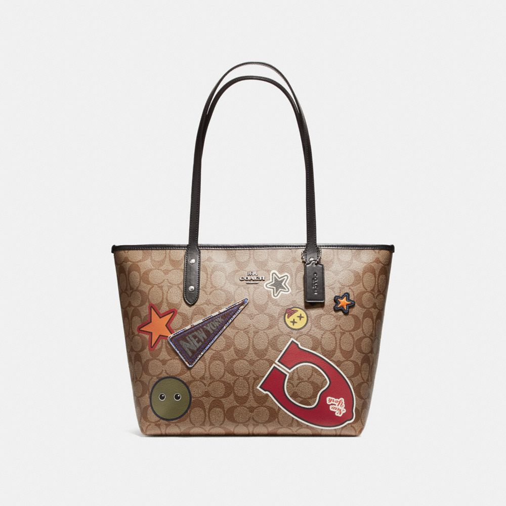 1. COACH f20910 - CITY ZIP TOTE IN SIGNATURE COATED CANVAS WITH VARSITY PATCHES - SILVER/KHAKI/BLACK